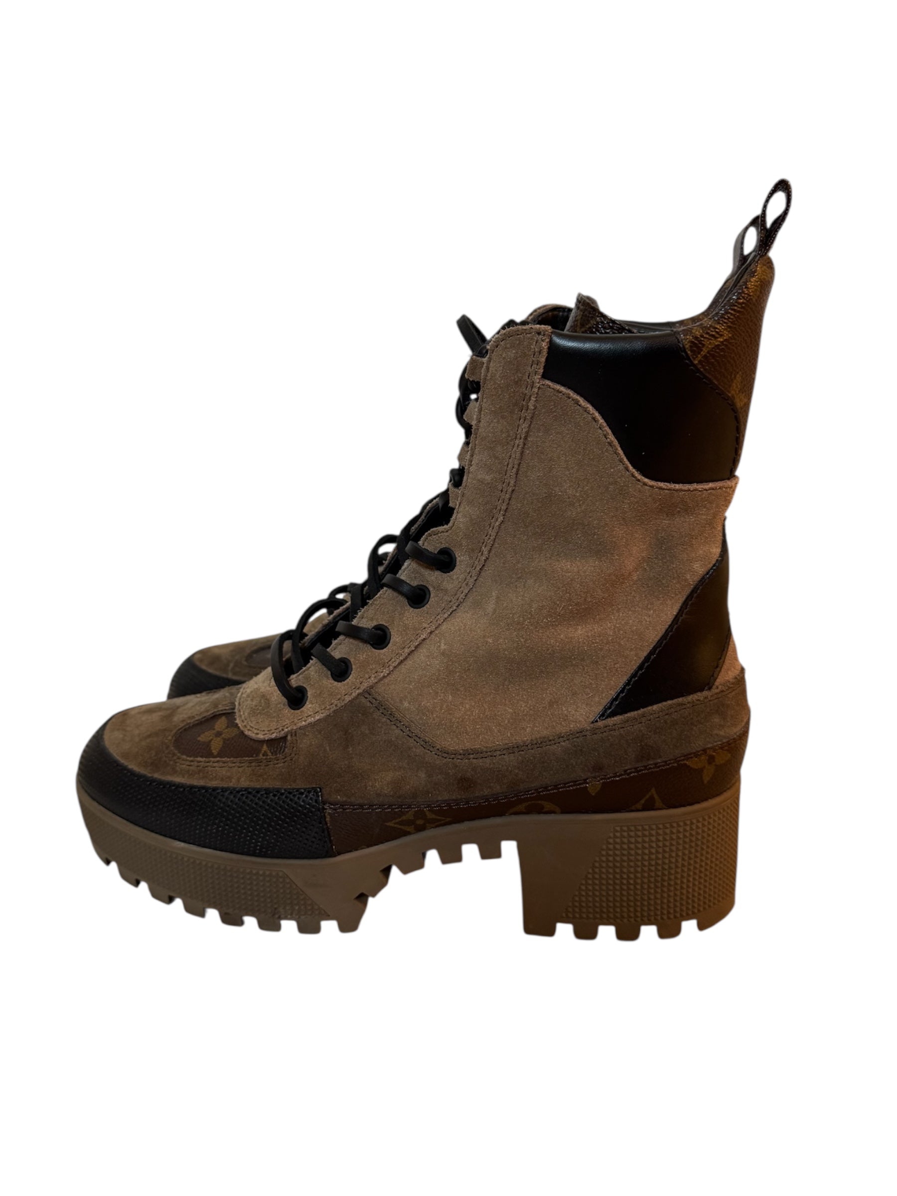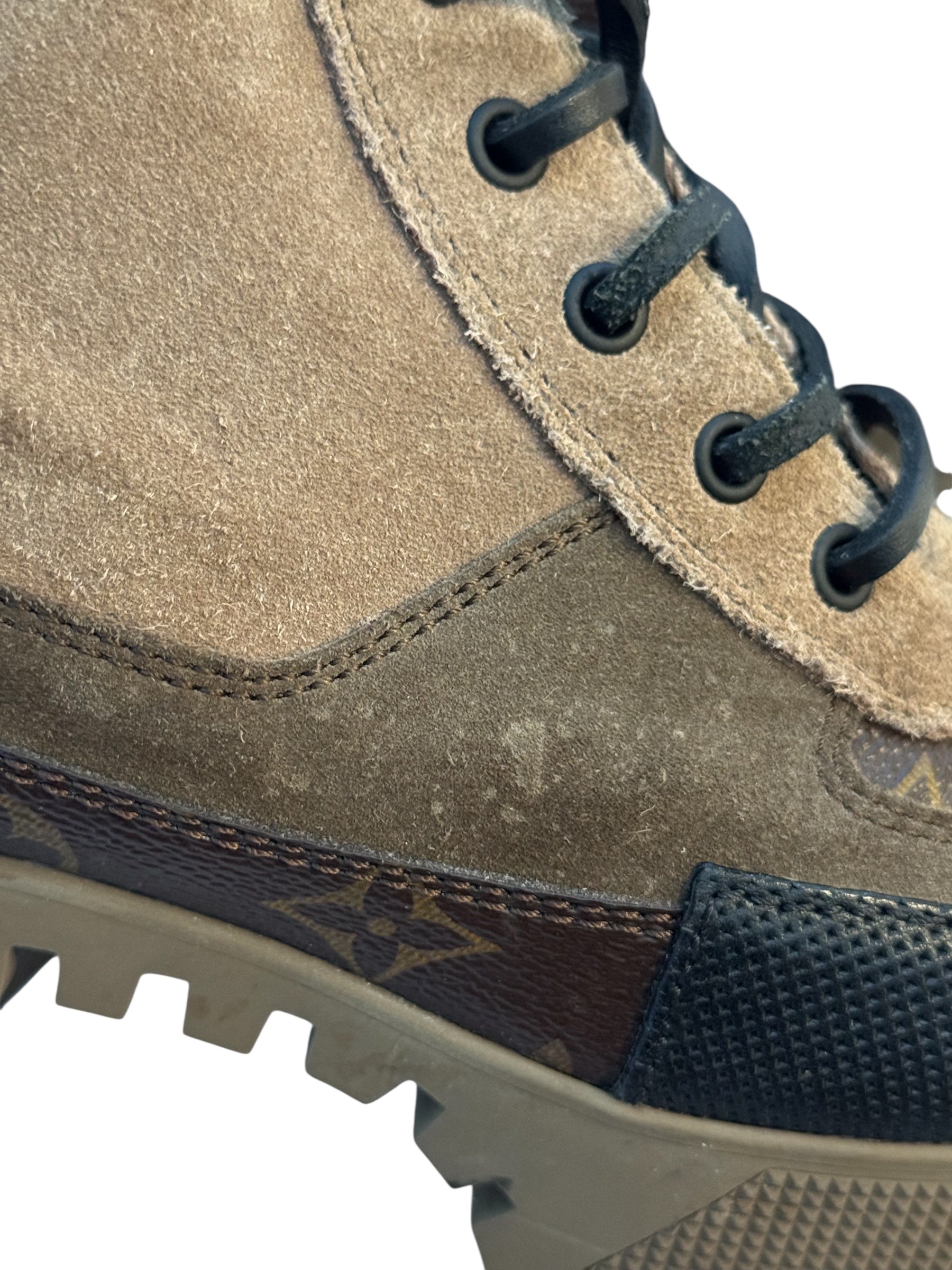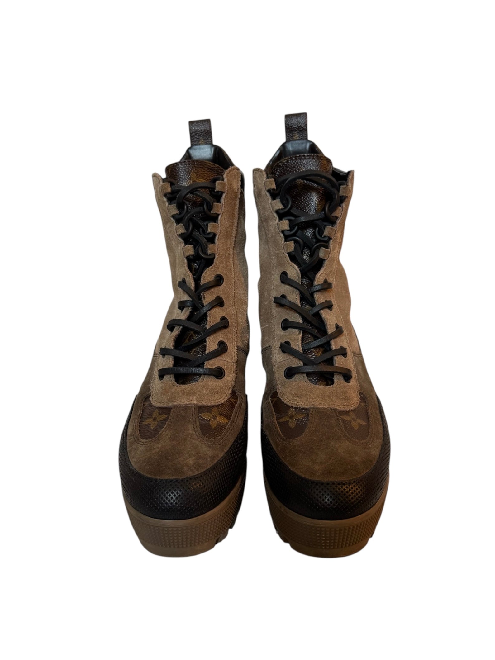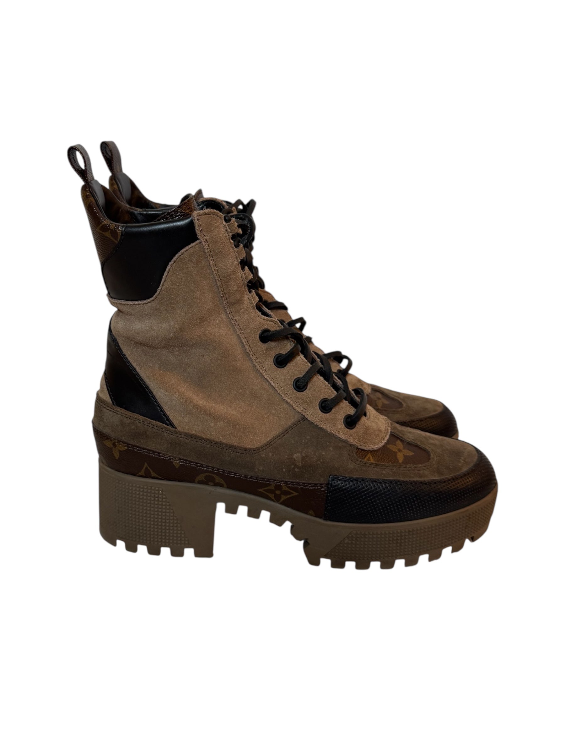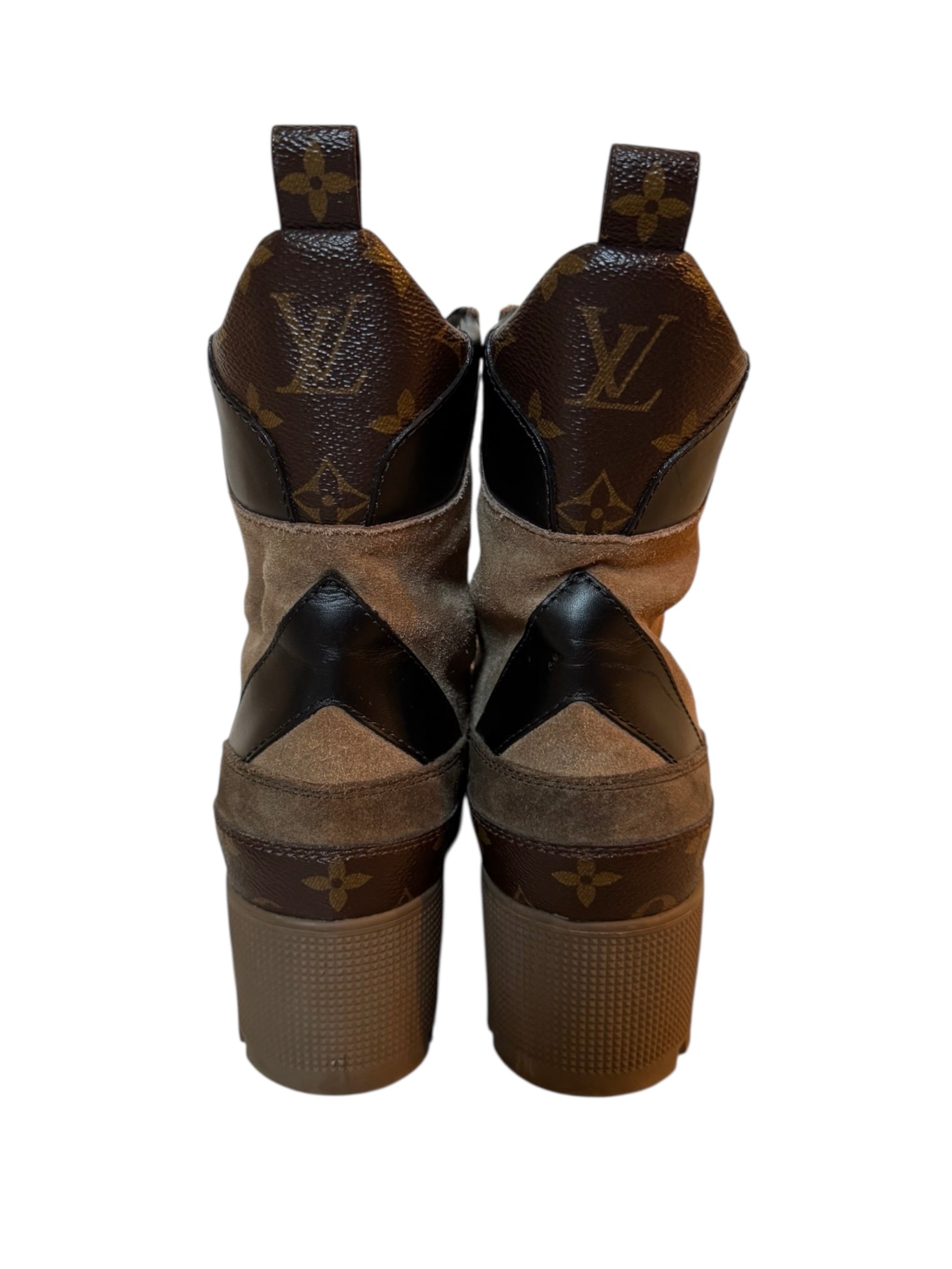 Louis Vuitton Suede Calfskin Monogram Laurete Platform Desert Boots Taupe