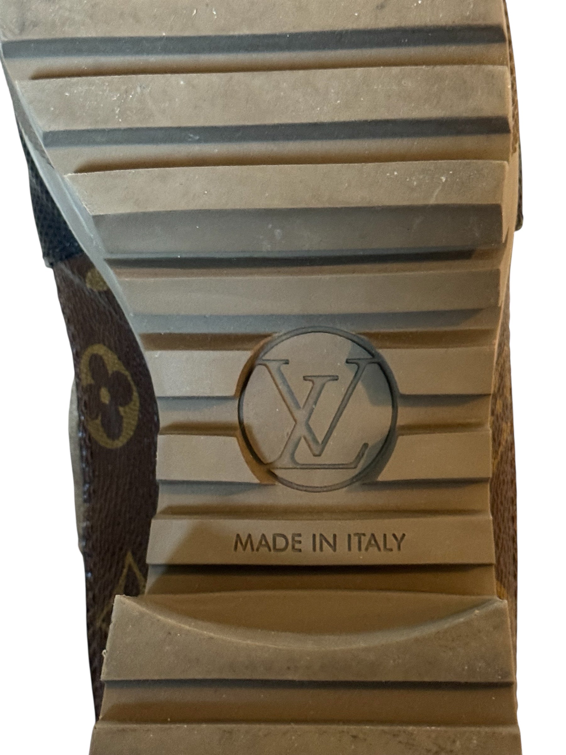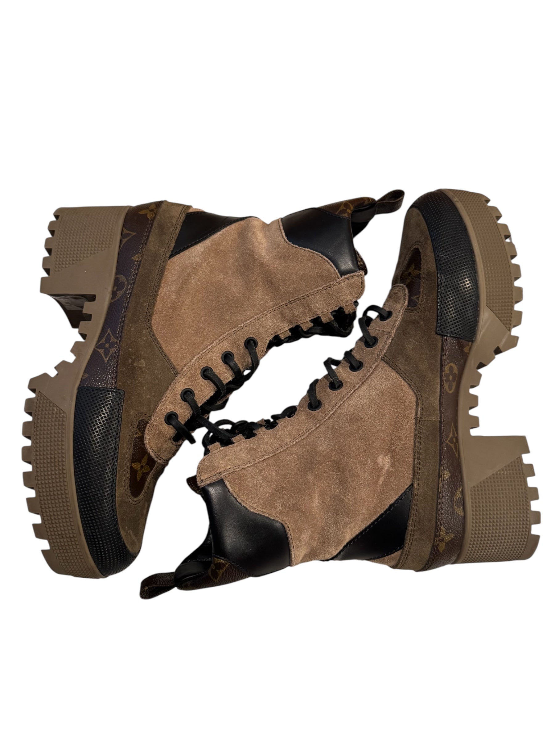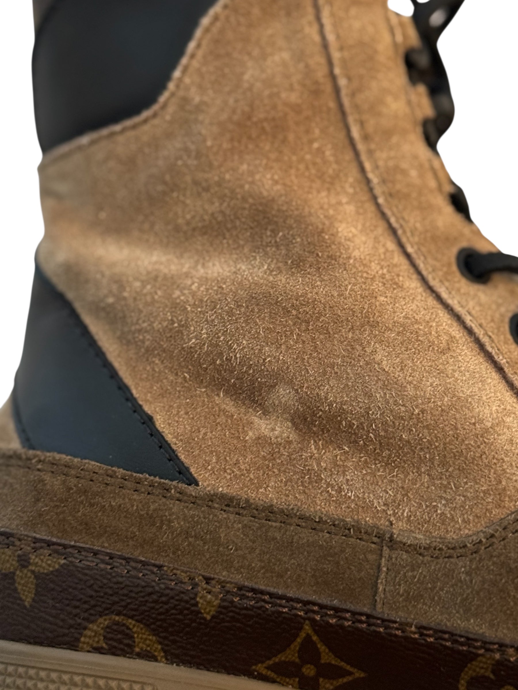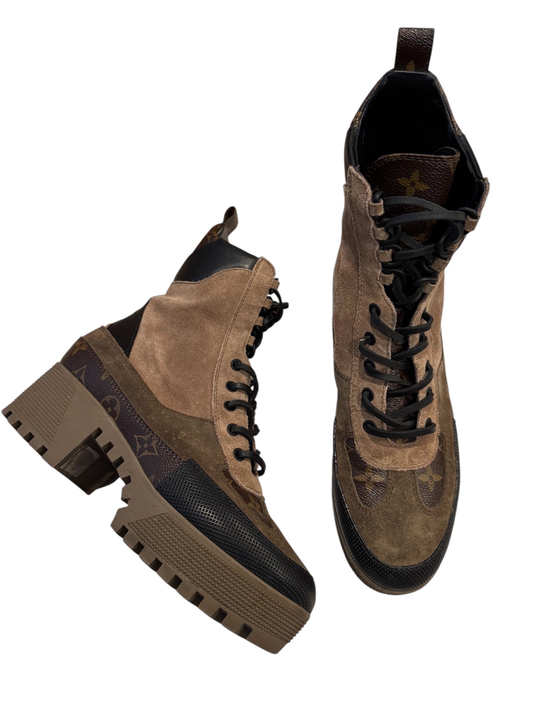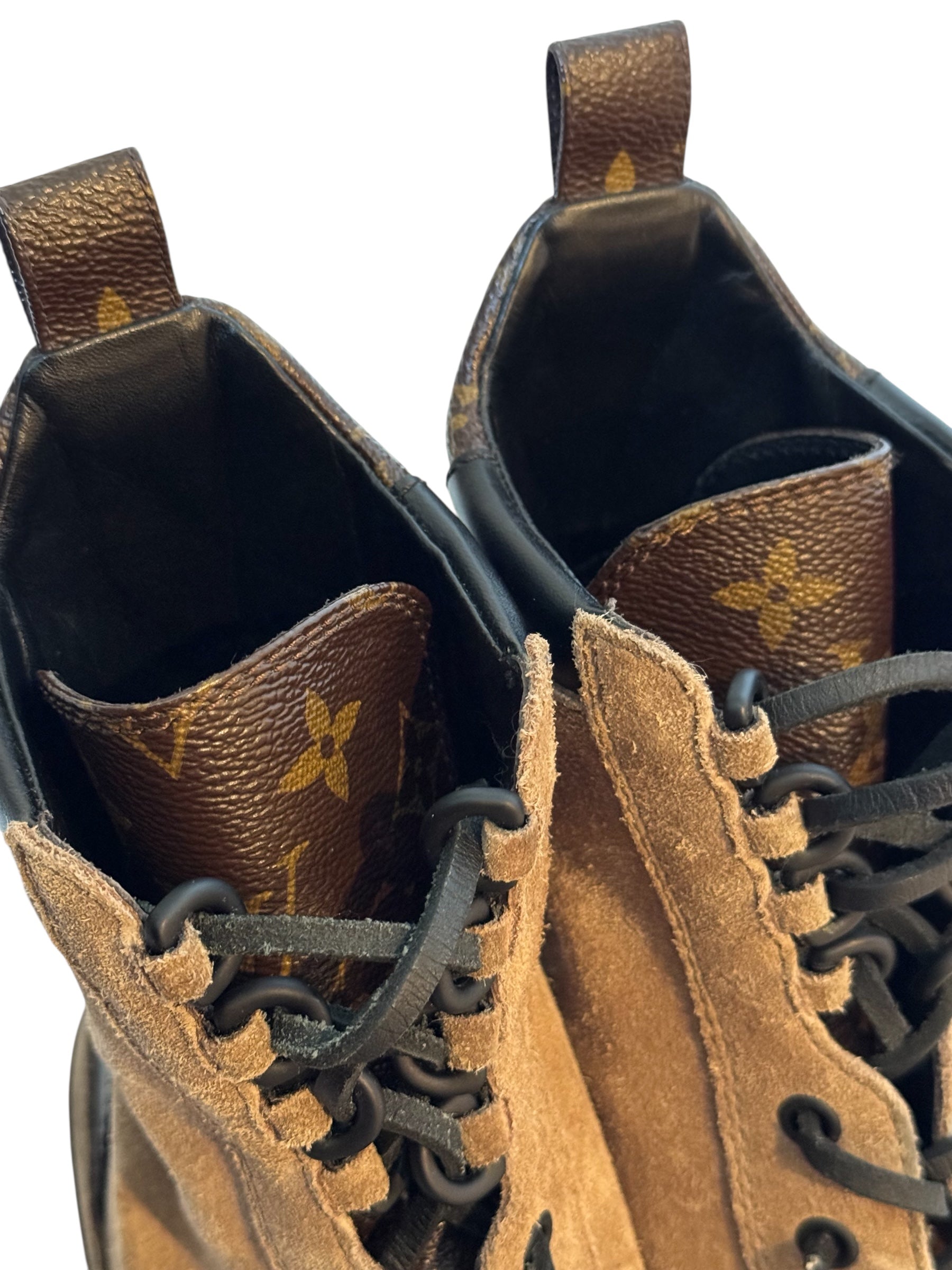 Louis Vuitton Suede Calfskin Monogram Laurete Platform Desert Boots Taupe